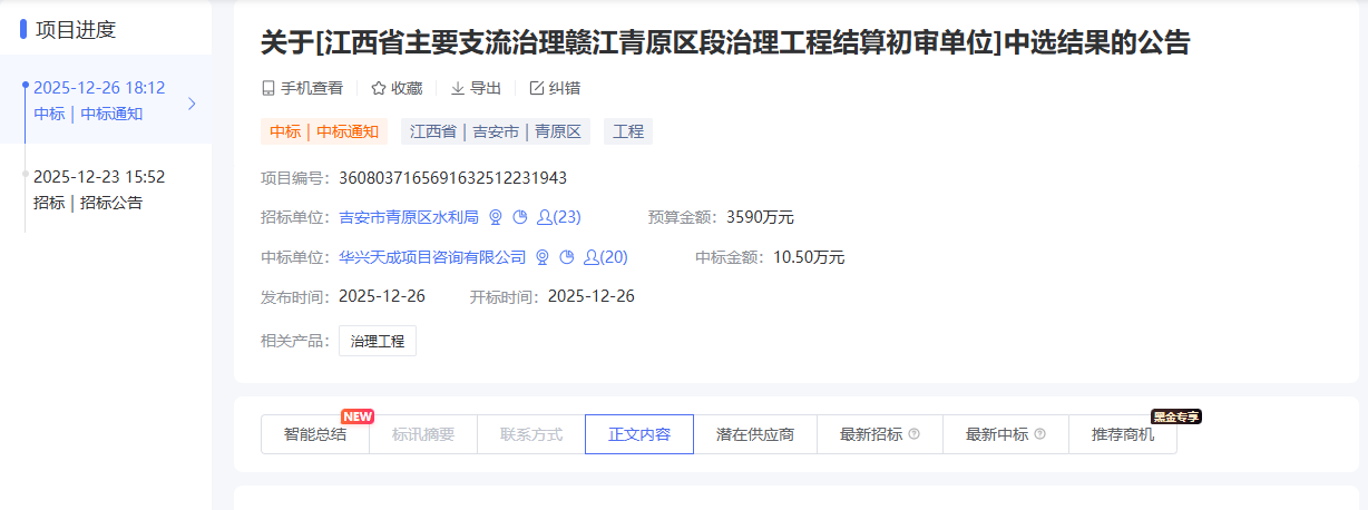 我公司参与了“江西省主要支流治理赣江青原区段治理工程结算审核服务项目”,经评审委员会综合评审,项目业主确认,确定华兴天成项目咨询有限公司成功中标江西省主要支流治理赣江青原区段治理工程结算审核服务项目。