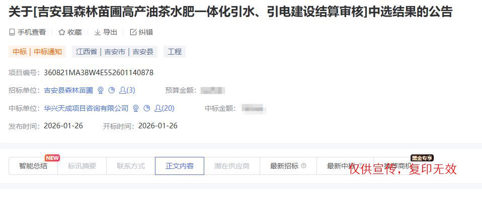 我公司参与了“吉安县森林苗圃高产油茶水肥一体化引水、引电建设结算审核”服务项目,经评审委员会综合评审,项目业主确认,确定华兴天成项目咨询有限公司成功中标吉安县森林苗圃高产油茶水肥一体化引水、引电建设结算审核服务项目。