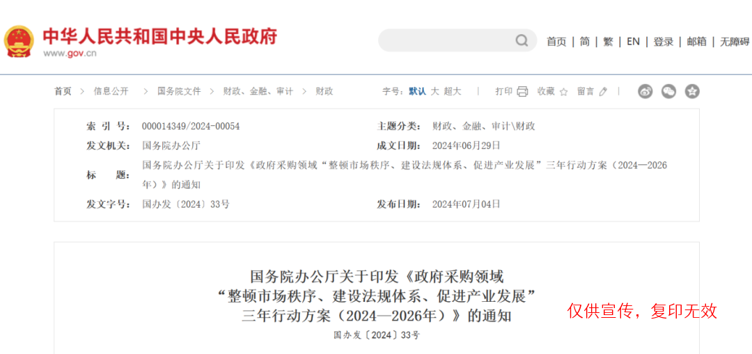 国务院办公厅发布关于印发《政府采购领域“整顿市场秩序、建设法规体系、促进产业发展”三年行动方案(2024—2026年)》的通知(国办发〔2024〕33号)明确: