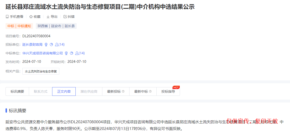 近日,我公司参与了“延长县郑庄流域水土流失防治与生态修复项目(二期)的招标代理机构”,经评审委员会综合评审,项目业主确认,确定华兴天成项目咨询有限公司成功入选延长县郑庄流域水土流失防治与生态修复项目(二期)招标代理。