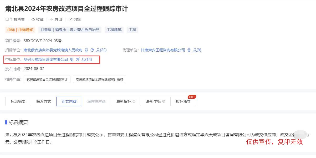 我公司参与了“肃北县2024年农房改造项目全过程跟踪审计服务项目”,经评审委员会综合评审,项目业主确认,确定华兴天成项目咨询有限公司成功中标肃北县2024年农房改造项目全过程跟踪审计服务项目。