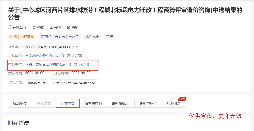 我公司参与了“中心城区河西片区排水防涝工程城北标段电力迁改工程预算评审造价咨询”,经评审委员会综合评审,项目业主确认,确定