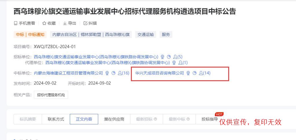 我公司参与了“西乌珠穆沁旗交通运输事业发展中心招标代理服务机构遴选项目”,经评审委员会综合评审,项目业主确认,确定华兴天成项目咨询有限公司成功入围西乌珠穆沁旗交通运输事业发展中心招标代理服务机构。