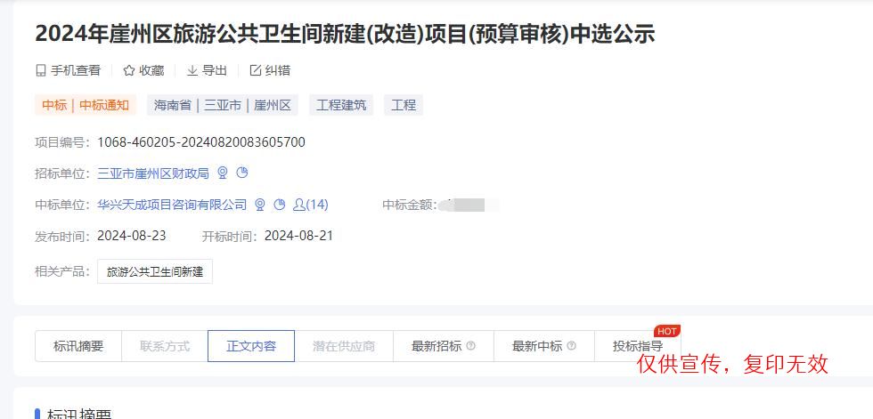 我公司参与了“2024年崖州区旅游公共卫生间新建(改造)项目”,经评审委员会综合评审,项目业主确认,确定
