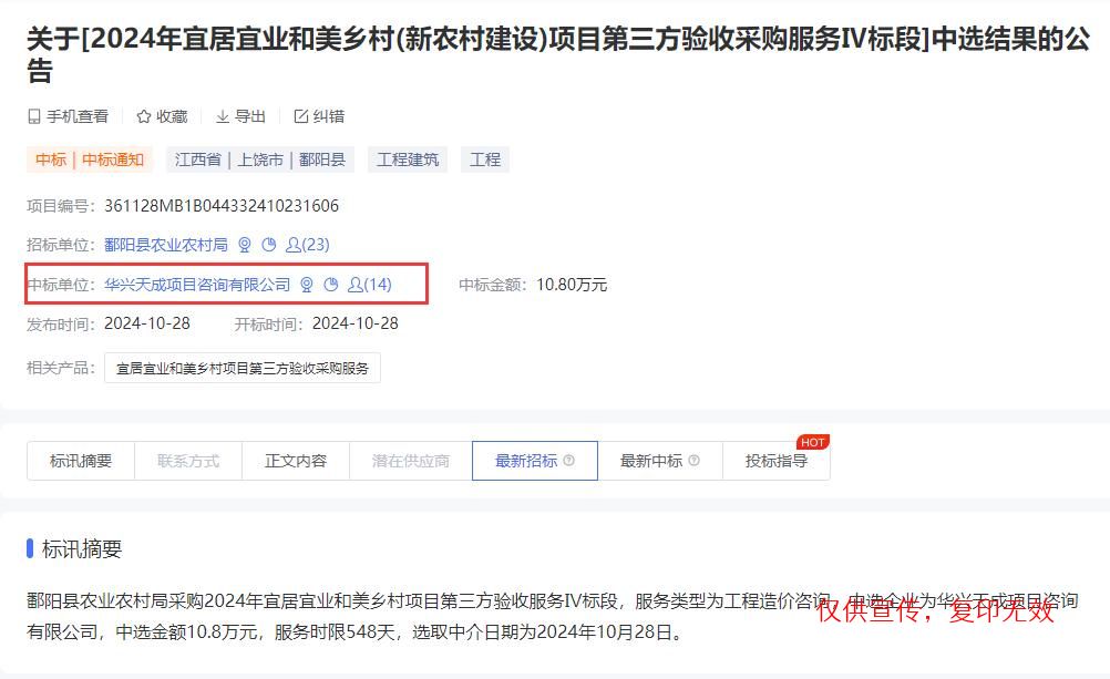 我公司参与了“2024年宜居宜业和美乡村(新农村建设)项目第三方验收采购服务项目”,经评审委员会综合评审,项目业主确认,确定