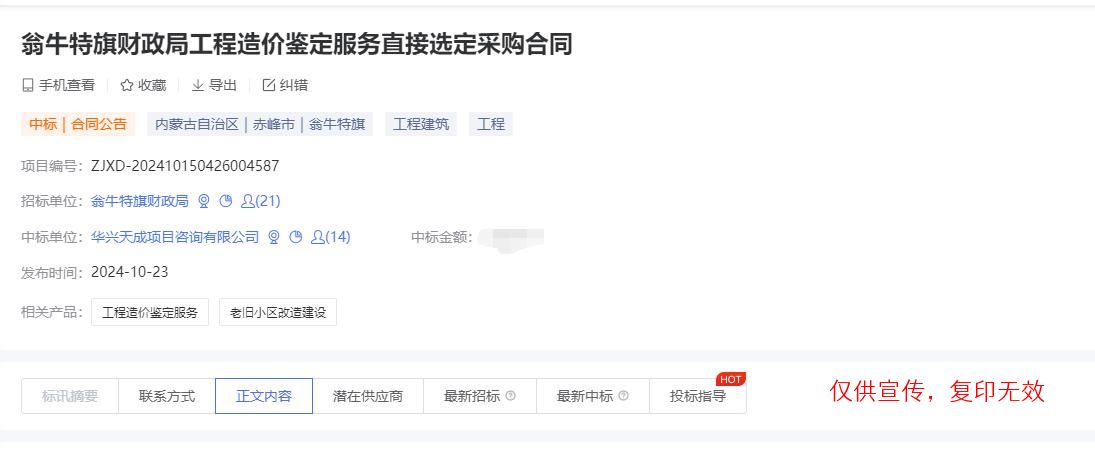 天成项目咨询有限公司成功中标翁牛特旗财政局工程造价鉴定服务项。