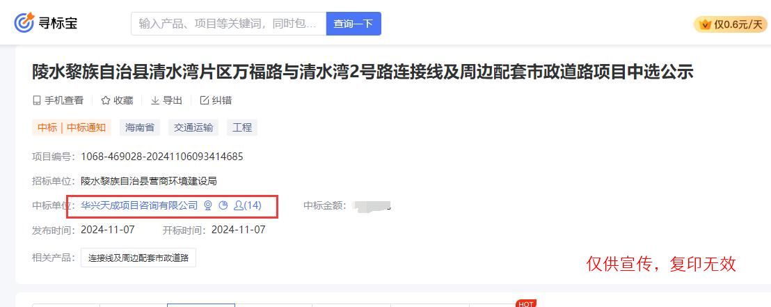 近日,我公司参与了“陵水黎族自治县清水湾片区万福路与清水湾2号路连接线及周边配套市政道路项目”,经评审委员会综合评审,项目业主确认,确定华兴天成项目咨询有限公司成功中标陵水黎族自治县清水湾片区万福路与清水湾2号路连接线及周边配套市政道路项目。