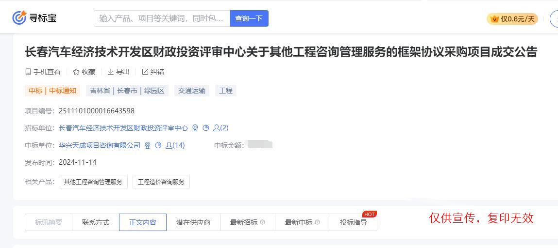 天成项目咨询有限公司成功中标长春汽车经济技术开发区财政投资评审中心关于其他工程咨询管理服务的框架协议采购项目。