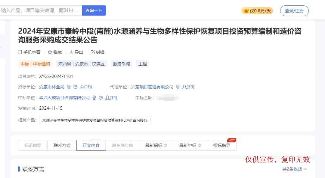 我公司参与了“2024年安康市秦岭中段(南麓)水源涵养与生物多样性保护恢复项目投资预算编制和造价咨询服务项目”,经评审委员会综合评审,项目业主确认,确定