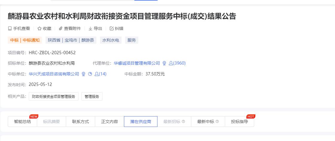 天成项目咨询有限公司成功中标麟游县农业农村和水利局财政衔接资金项目管理服务。