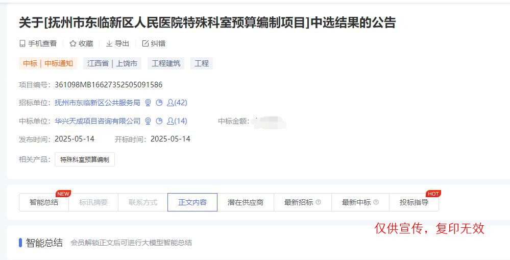 我公司参与了“抚州市东临新区人民医院特殊科室预算编制服务项目”,经评审委员会综合评审,项目业主确认,确定华兴天成项目咨询有限公司成功中标抚州市东临新区人民医院特殊科室预算编制服务项目。