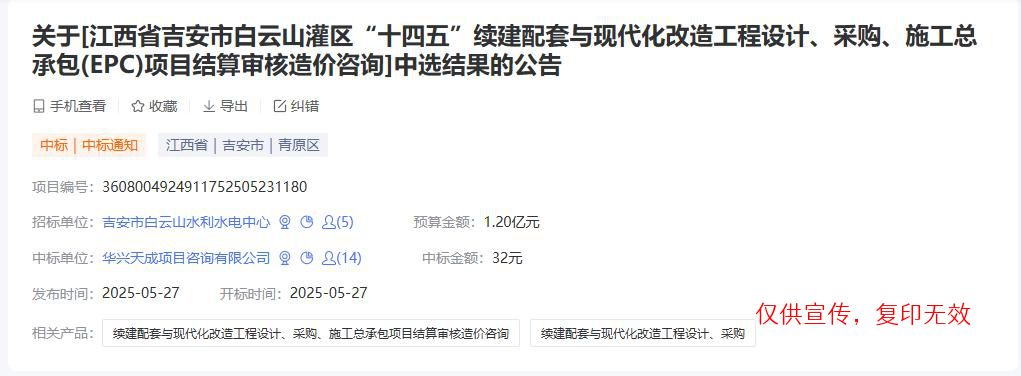 天成项目咨询有限公司成功中标江西省吉安市白云山灌区“十四五”续建配套与现代化改造工程设计、采购、施工总承包(EPC)项目结算审核造价咨询服务项目。