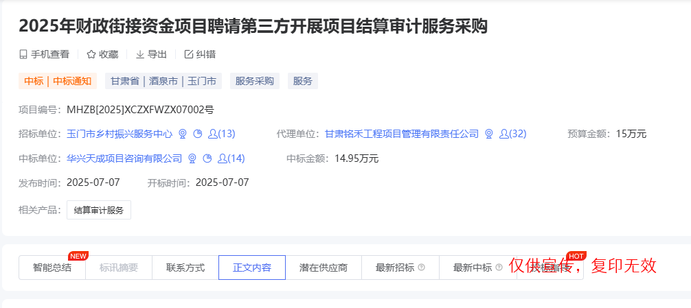 我公司参与了“2025年财政街接资金项目聘请第三方开展项目结算审计服务项目”,经评审委员会综合评审,项目业主确认,确定