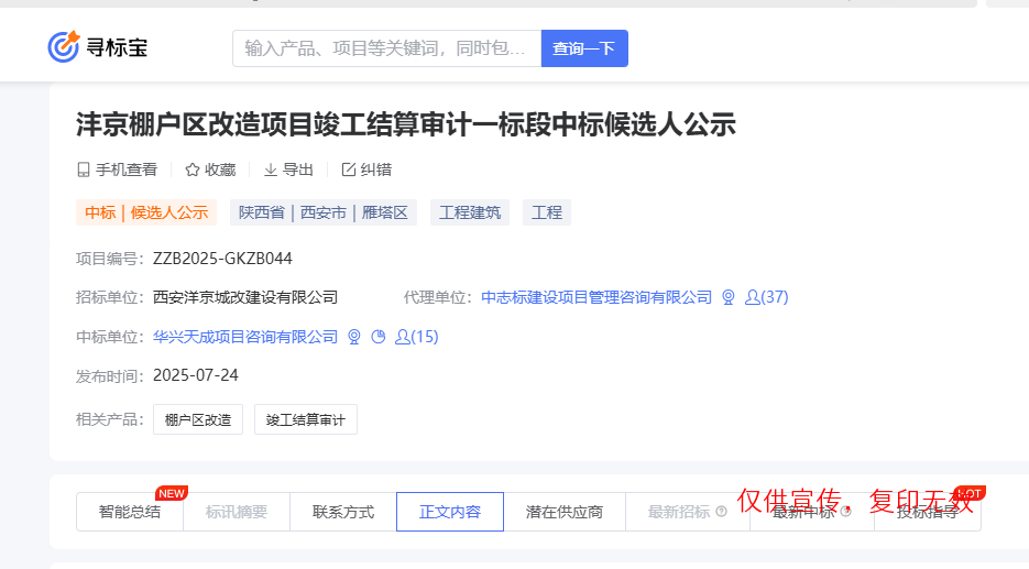 “沣京棚户区改造项目竣工结算审计服务项目”,经评审委员会综合评审,项目业主确认,确定