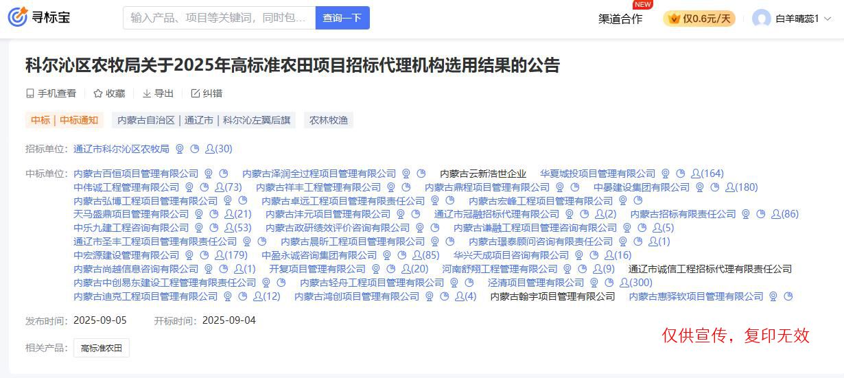 “科尔沁区农牧局关于2025年高标准农田项目招标代理机构选用项目”,经评审委员会综合评审,项目业主确认,确定