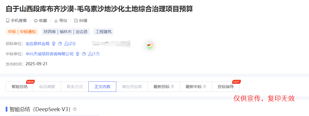 我公司参与了“白于山西段库布齐沙漠-毛乌素沙地沙化土地综合治理项目预算审核”,经评审委员会综合评审,项目业主确认,确定华兴天成项目咨询有限公司成功中标白于山西段库布齐沙漠-毛乌素沙地沙化土地综合治理项目预算审核服务项目。