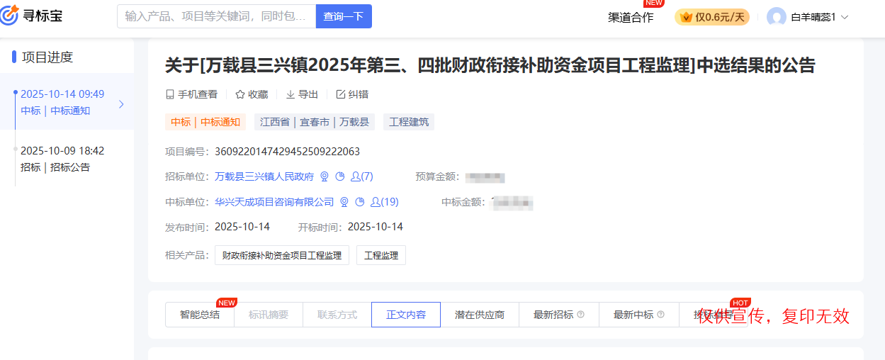 “万载县三兴镇2025年第三、四批财政衔接补助资金项目工程监理”,经评审委员会综合评审,项目业主确认,确定
