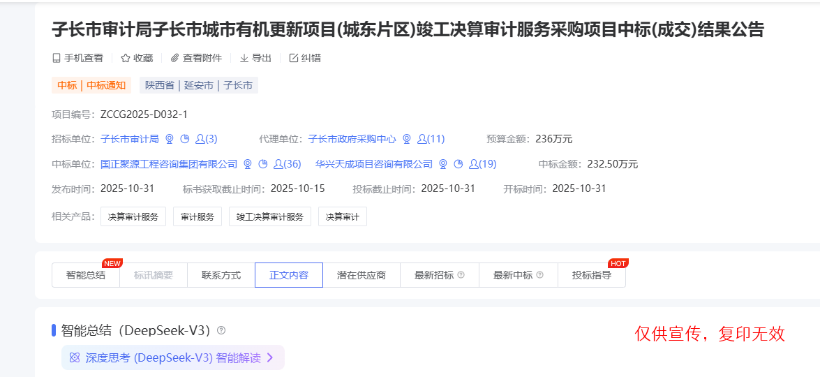 近日,我公司参与了“子长市审计局子长市城市有机更新项目(城东片区)竣工决算审计服务采购项目”,经评审委员会综合评审,项目业主确认,确定华兴天成项目咨询有限公司成功中标子长市审计局子长市城市有机更新项目(城东片区)竣工决算审计服务采购项目,项目投资额4.6亿元。