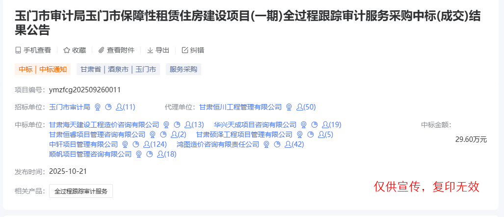我公司参与了“玉门市审计局玉门市保障性租赁住房建设项目(一期)全过程跟踪审计服务”,经评审委员会综合评审,项目业主确认,确定华兴天成项目咨询有限公司成功中标玉门市审计局玉门市保障性租赁住房建设项目(一期)全过程跟踪审计服务项目。