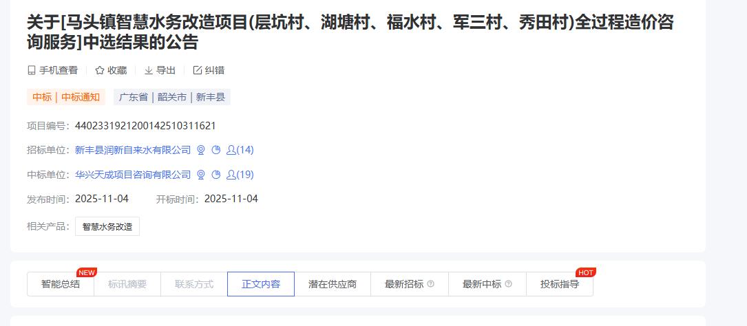 天成项目咨询有限公司成功中标马头镇智慧水务改造项目(层坑村、湖塘村、福水村、军三村、秀田村)全过程造价咨询服务。